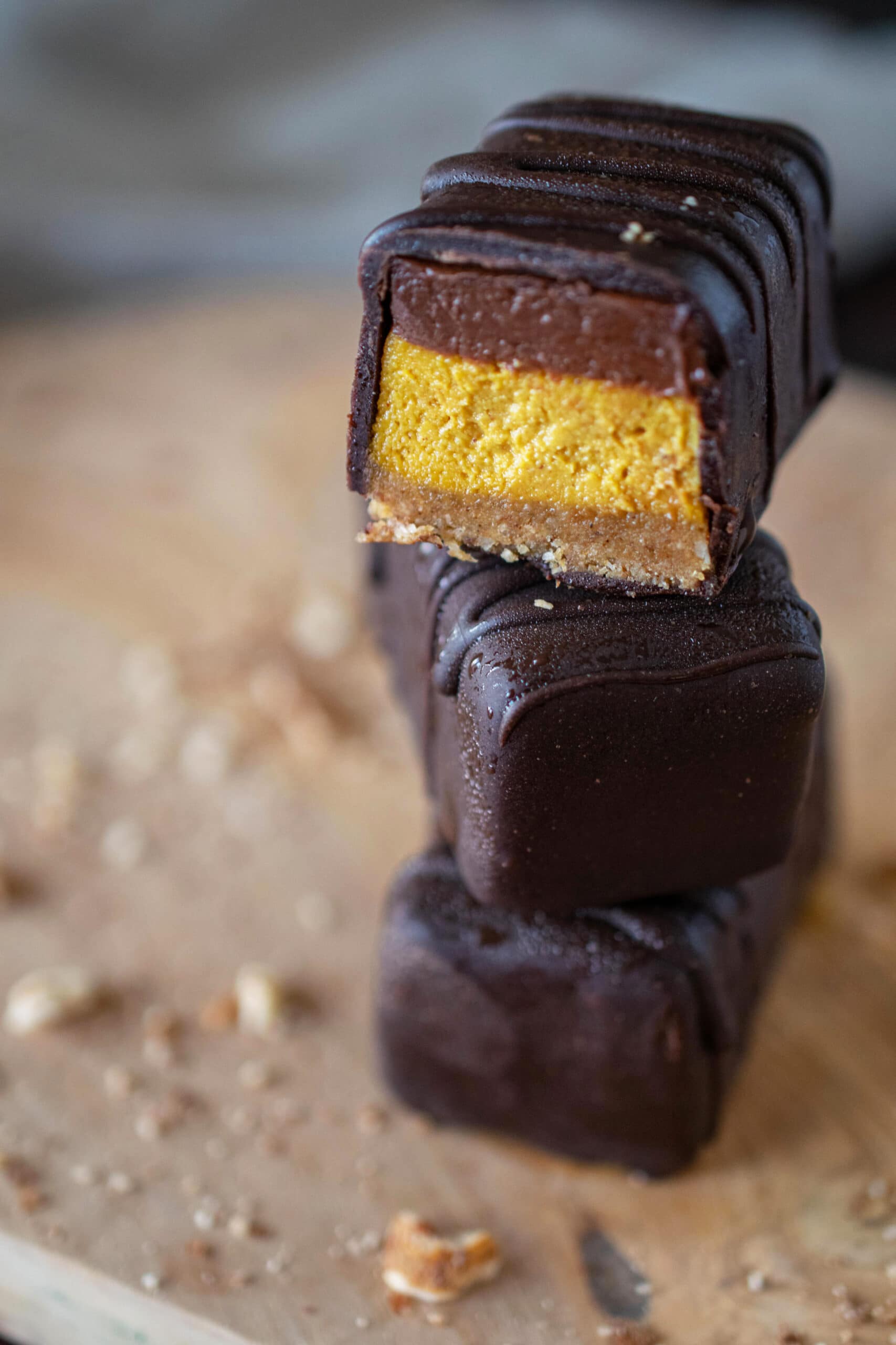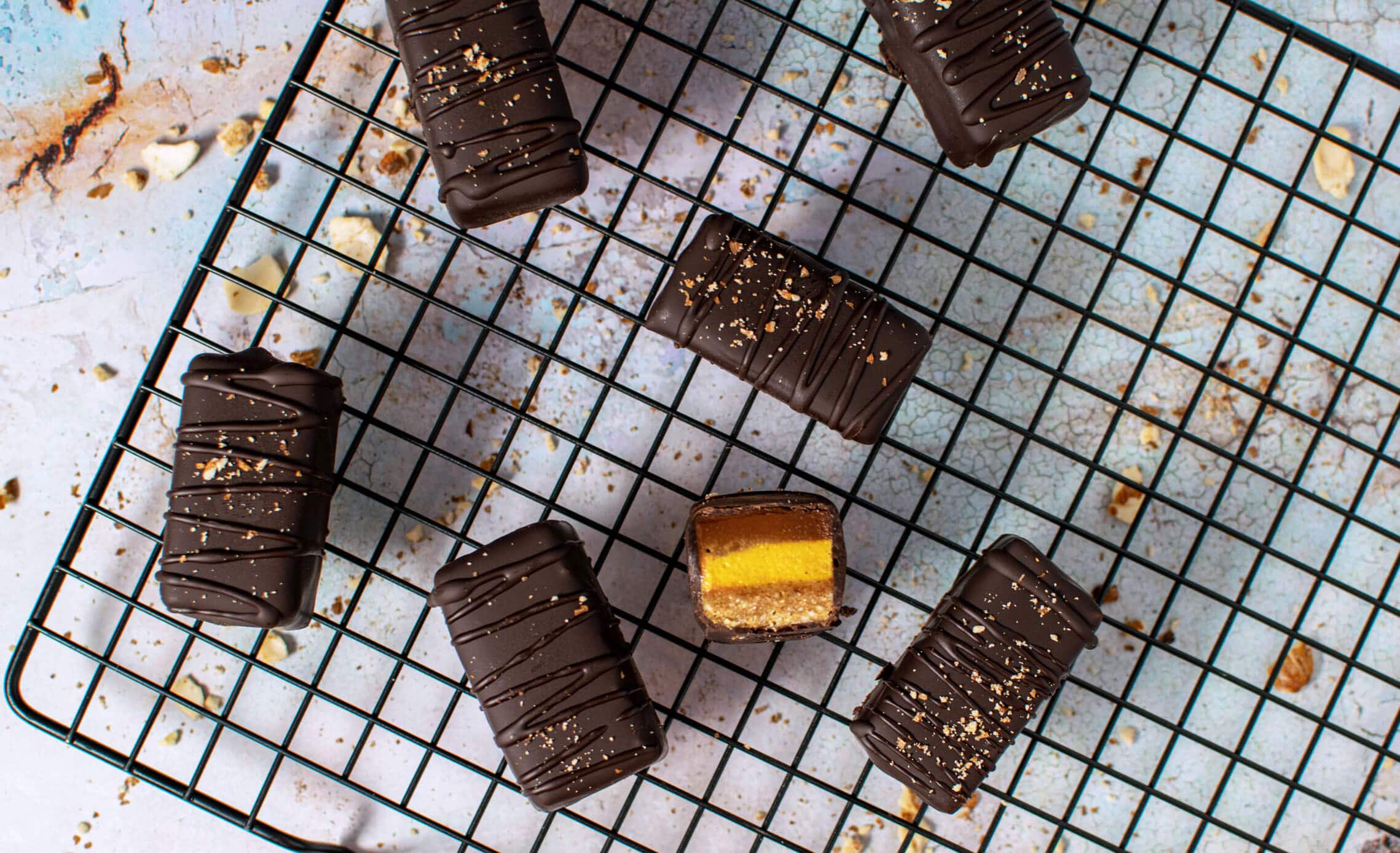 - Assembly: Remove pan from freezer and cut into 2” x 1” bars with a very sharp knife while mixture is still frozen. Enrobe in melted dark chocolate and set in freezer for 15 minutes.