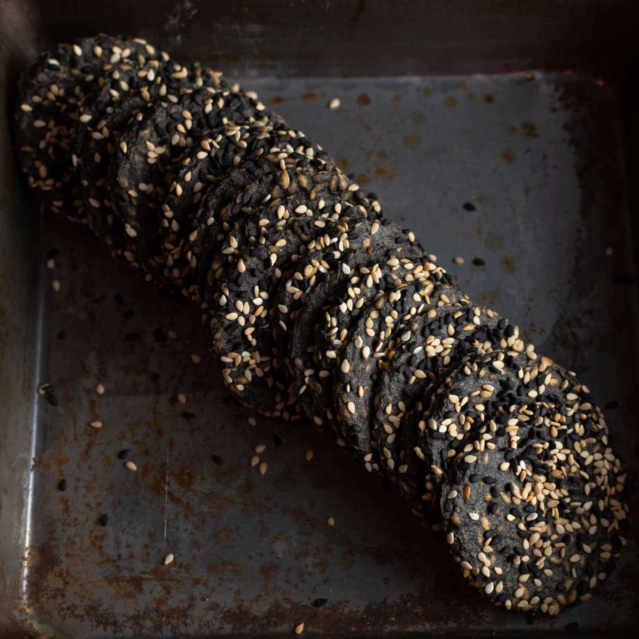 When you flip your crackers onto a mesh tray, do it on a surface as some of the sesame seeds that you used as a garnish on top will fall. The little mess is well worth it as you can see they look amazing with the two colored seeds on top.