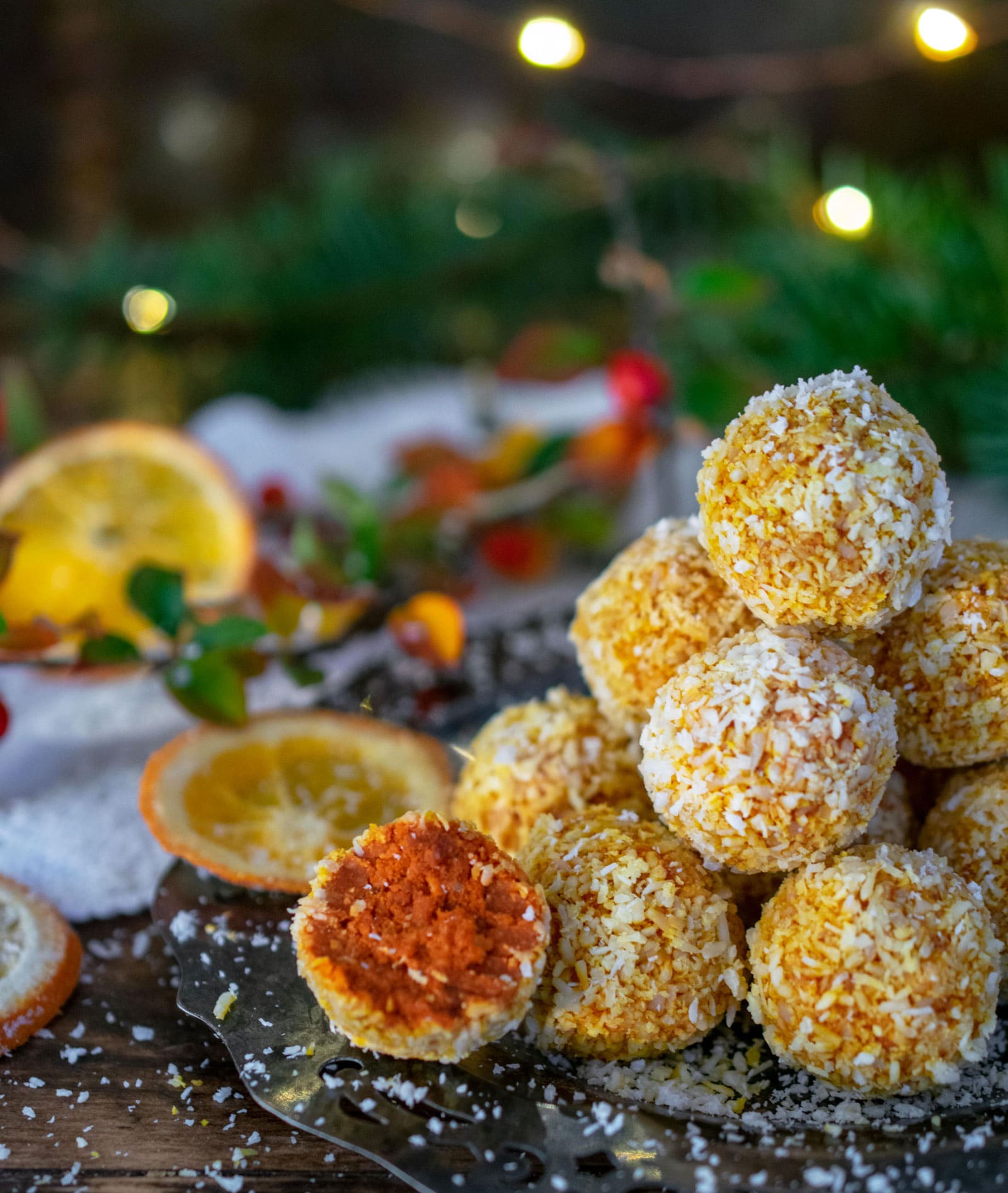 These delights are packed full of Christmas flavors – orange, ginger and nutmeg in a base of coconut and goji berries.
