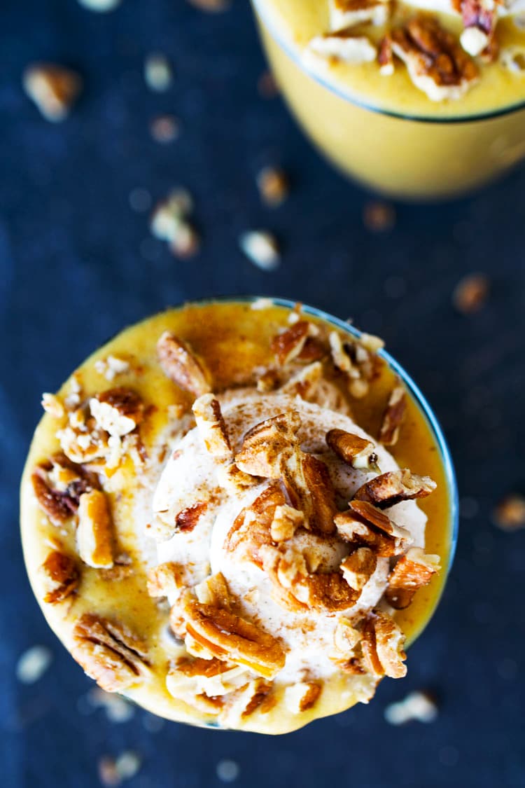 - Place a dollop of coconut whipped cream on top of the pumpkin pie milkshake and garnish with pecans.